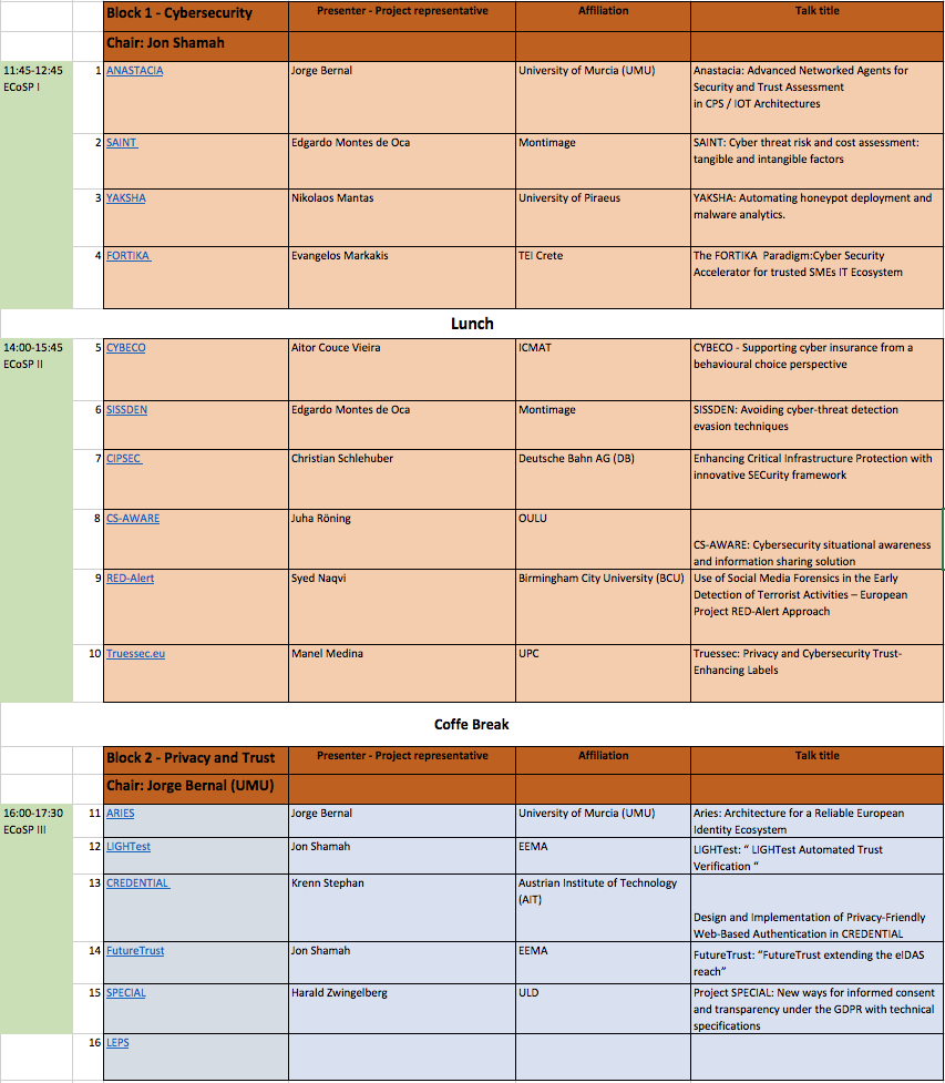 Representatives of H2020 European research projects in the scope of Security and Privacy are invited to join this clustering event. The call for participation is twofold. On the one hand, it targets general presentations of European projects to the community of experts (mainly for projects in the first year of their lifetime). On the other hand, the workshop also aims to cover technical presentations about the latest research advances, techniques, outcomes, and evaluations achieved in the scope of EU projects.